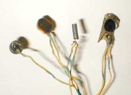 The block labled "Module" represents the "mystery" module shown in Fig. 4. In fact, it is shorted, making the gold and silver settings electrically identical. In the other Electroscope Report, that author described the module as a "watch I.C. module". It doen't appear to me to be a watch module, but it does appear to be surplus scrap. It so happens, that this module is identical to one that I found inside the "Phaser" described in the Model 20 report, and is the right-most item shown in Fig. 6. |
