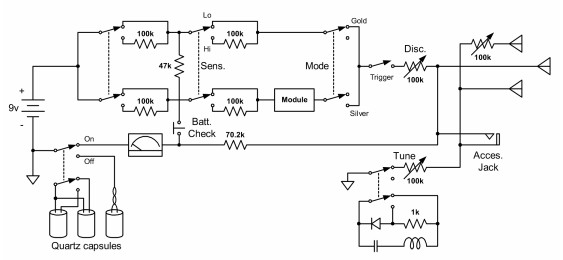 The circuitry in the Model 301 mostly just drains the battery. The gold mode and silver mode are electrically identical. The control knob on the bottom of the unit does nothing. The "Tune" knob does nothing at all, unless an accessory module is plugged in to the handle. The "Disc." knob, additional switches, and meter make up a circuit that applies a variable DC voltage across the antennae. The epoxy modules and the "mystery module" are nothing but junk designed to dissuade casual inspection. |